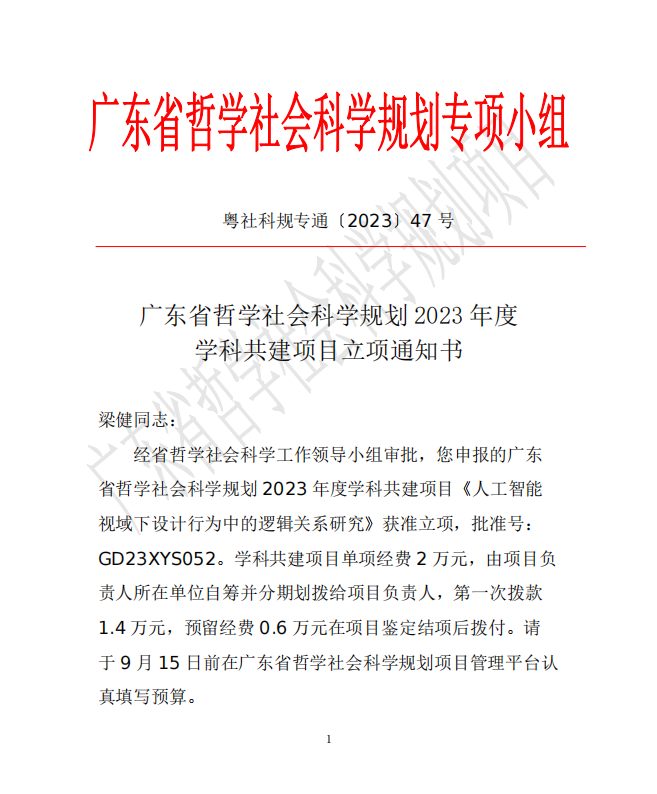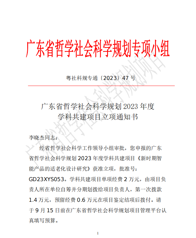经广东省哲学社会科学工作领导小组批准(广东省社科规划办,http://www.gdpplgopss.org.cn/tzgg/content/post_1127279.html ),广东省哲学社会科学规划2023年度学科共建项目立项名单于2023年9月5日发布,全省共立项811项,其中由公司梁健老师和李晓杰老师分别申报主持的两项艺术类项目位列其中(全校共获得3项),主题分别是《人工智能视域下设计行为中的逻辑关系研究》和《新时期智能产品的适老化设计研究》。
