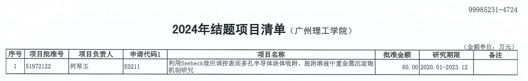 (李嘉嘉  詹夏然)日前,公司接到国家自然科学基金委员会通知,公司何琴玉教授主持的国家自然科学基金项目《利用Seebeck效应调控表面多孔半导体块体吸附、脱附溶液中重金属沉淀物机制研究》(批准号51972122)通过国家自然科学基金委员会验收,顺利如期结项。这是公司首个国家自然科学基金结题项目,是公司科研工作的又一项重要突破。