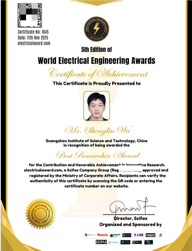 近日,bevictor伟德官网吴晟霖老师在外骨骼机器人人因功效测试研究取得了重要进展,研究经多轮次遴选和评审委员会评审,获国际知名学术组织“科学之父”(Scifax)颁发的2025年“第5届世界电气工程奖-最佳研究者奖(Best Researcher Award, 5th Edition of World Electrical Engineering Awards)”。该奖项旨在表彰在创新研究方面有着重要贡献和杰出成就的学者。