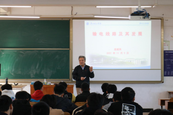 讲座二《输电线路以及发展》,孟遂民教授从国内外输电线路任务,电流性质以及输电线路分类进行论述,他引导在座同学学习我国电力工作者不怕吃苦,勇敢创新的中国电力精神。