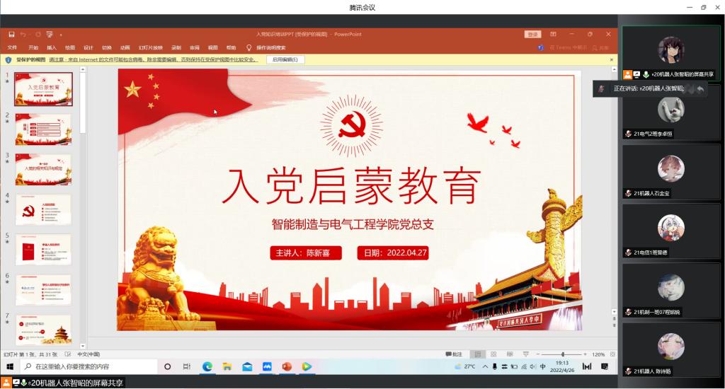 4月26日晚,为加强全院员工对中国共产党的认识,提高思想觉悟,端正入党动机,积极向党组织靠拢,根据公司三全素质活动周的工作要求和公司党总支的党建引领安排,公司党总支通过线上腾讯会议的形式,对全院所有在校员工进行入党基本知识培训。五场线上会议分别由员工党支部支委潘展鸿、苏国辉、黄炅杲、苏国辉、张智昭主持。