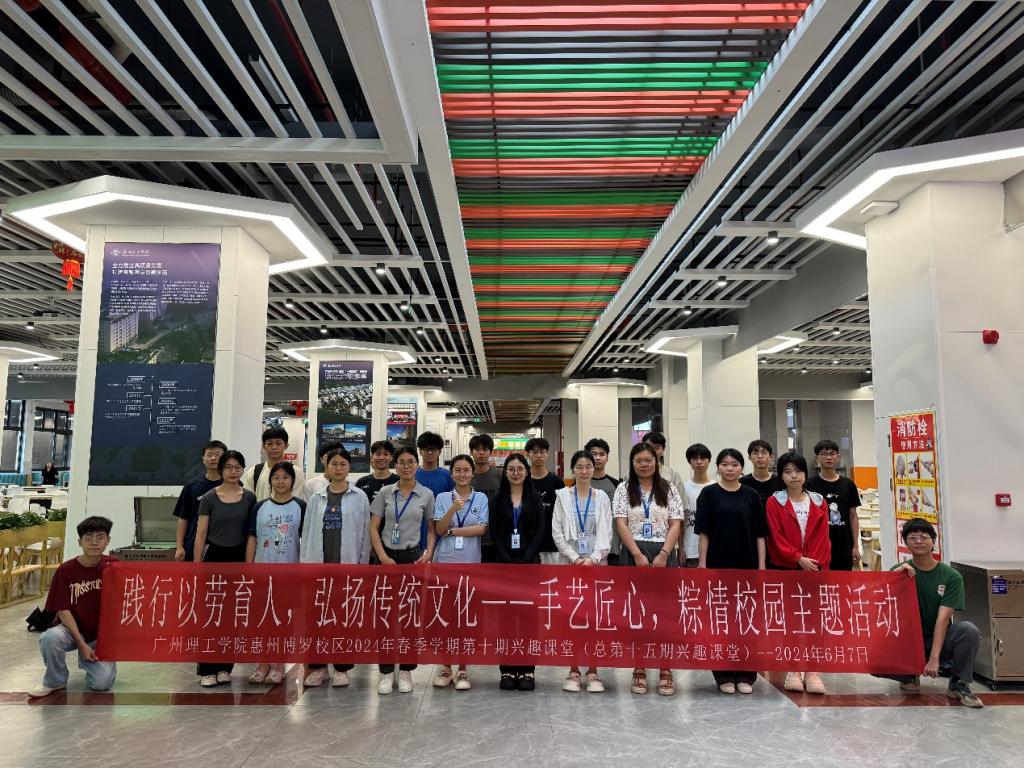 为弘扬中华传统节日文化,践行以劳育人与文化育人成效,同时为了让员工更好体验传统美食的制作过程,6月7日下午20名余名师生代表在惠州博罗校区第一饭堂开展“践行以劳育人,弘扬传统文化——手艺匠心,粽情校园”主题活动。活动由辅导员谢燕惠老师、朱玲老师组织。