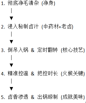 云路卤鹅非遗工艺流程严谨独特,核心分为五大环节:精选鹅源、精细净毛、秘方卤制、精准控温、匠心晾制。其精髓在于传承百年的独家配方与“倒吊翻转”等核心技艺,对火候、时间要求近乎苛刻。尤为关键的是,打造现代化无尘车间,将传统工艺与现代卫生标准深度融合。这不仅最大程度保障了卤鹅的卓越品质与纯正风味,更以标准化、清洁化的生产方式,显著提升了非遗产品的安全性与市场竞争力,为这一珍贵饮食文化的活态传承与创新发展提供了强大助力。