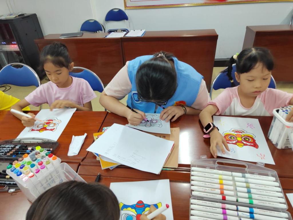活动最后,给小朋友们分发绘画工具,指导小朋友创作醒狮主题画作。孩子们结合所学知识,用鲜艳的色彩勾勒狮头轮廓,在互动中加深孩子们对醒狮文化符号的理解。