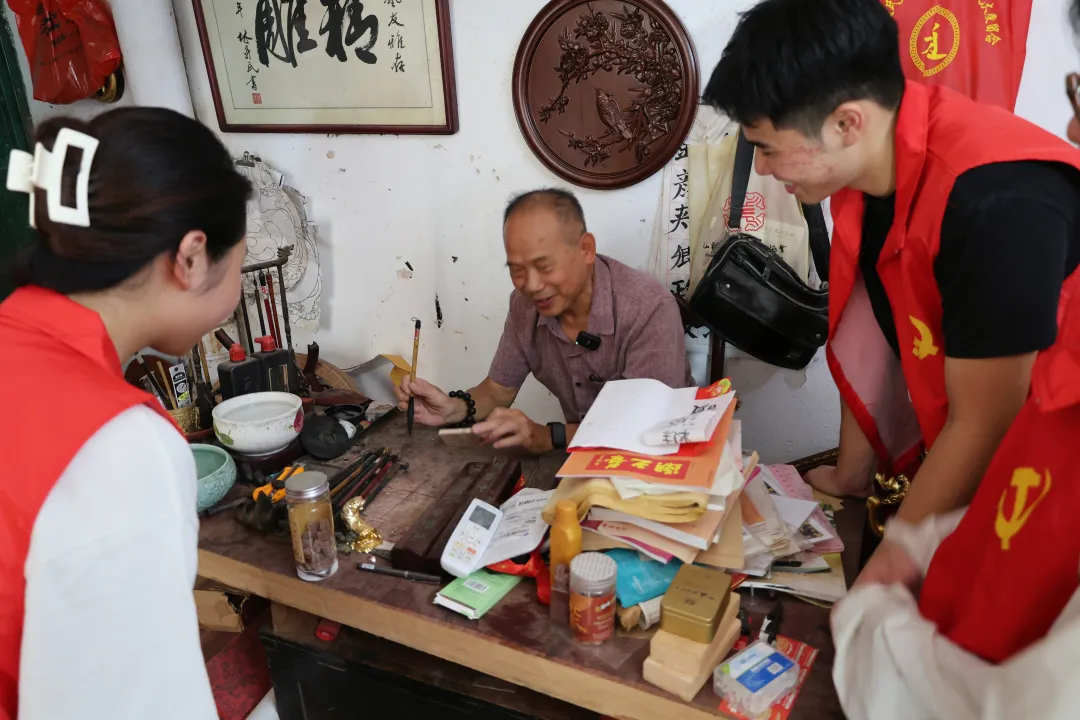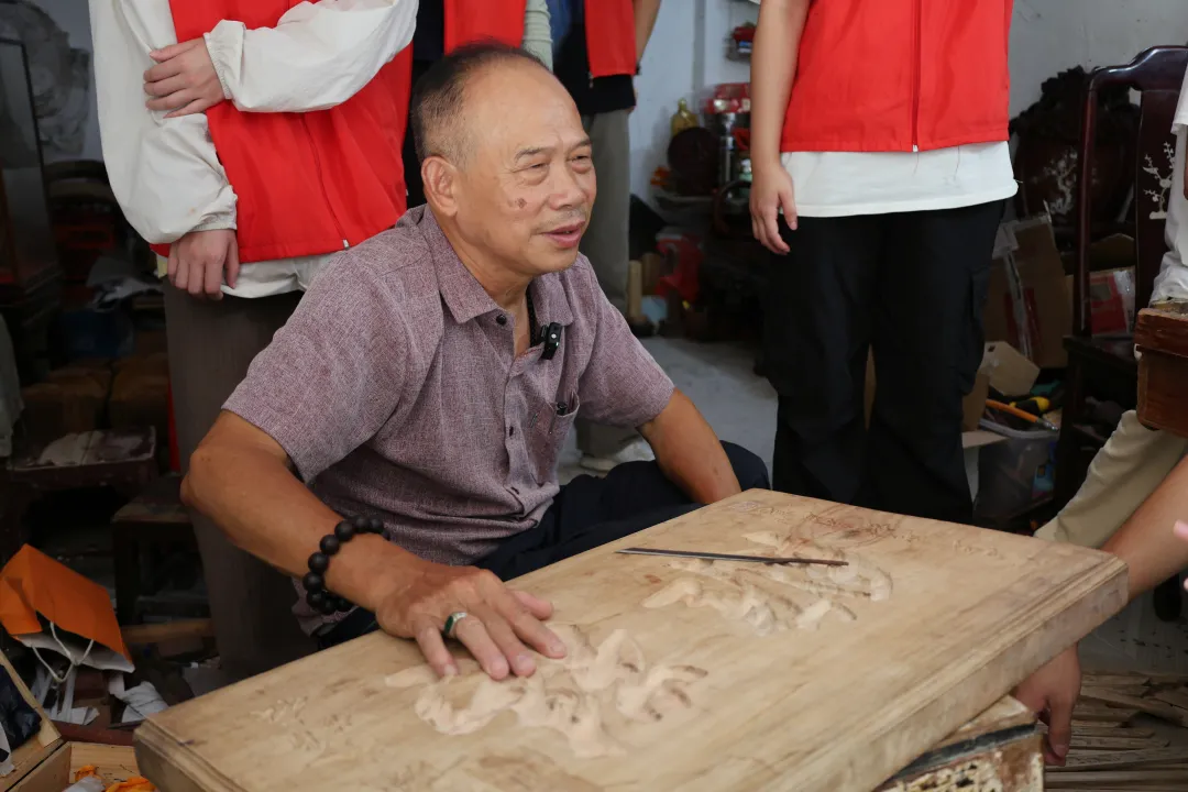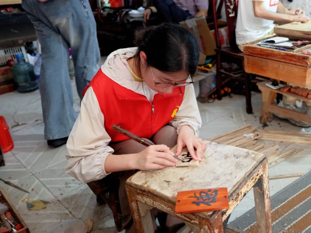 姚师傅首先向实践队员展示介绍了其作品集。从栩栩如生的花鸟瑞兽到端庄大气的祠堂装饰,每一件作品都凝聚着匠人的智慧与心血。在姚师傅指导下,队员们体验了完整的制作流程。首先,师傅带领队员在木坊选取樟木原料,经切割打磨获得平整木坯。随后,师傅用毛笔在木料上书写"吉"字墨稿,取“吉祥顺遂”之美意,一刀一划都是真挚的祈愿。队员们学习握刀方法,在师傅示范后尝试雕刻,感受刀锋与木纹的相互作用。师傅指导队员修整细节,使"吉"字逐渐立体呈现。通过这次实践,队员们亲身体验了传统木雕的制作流程和工艺要点。