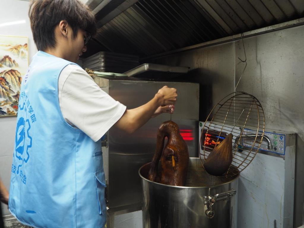实践队抵达揭东,首要任务是与非遗传承人谢奕亮、谢佳娜精准对接,确认实践路线与时间。核心目标明确:深度体验技艺、提升能力、多维推广、助力产业文化融合。队员们参观卤鹅门店,感受其在当地饮食文化中的地位;聆听历史、文化价值及产业挑战;实地考察鹅养殖场与制作空间,系统学习选鹅、卤制等关键环节,被传承人坚守精神深深打动,奠定调研与文化推广基础。