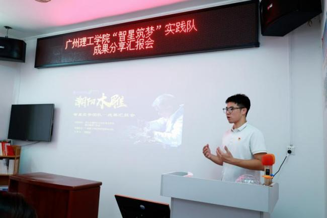 会上,实践队队员郑煜蓝代表团队进行了“木雕之‘韵’”项目汇报。他先对街道工作人员和带队老师的支持帮助表达感谢,随后围绕项目的调研背景、过程、成果及发展建议四个方面展开系统阐述。