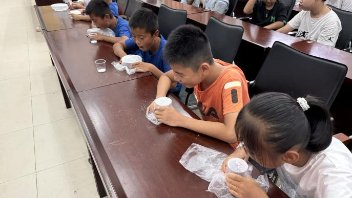 上午,实践队准备了科学探索主题课堂聚焦声音原理与节气知识。队员邱安志主讲的《声音的传递》课程设计为实验探究模式。其巧妙设置了多项简易实验:桌面振动感知、盐粒于保鲜膜表面跳动现象观察、水波模拟声波理解等。员工通过亲手触碰振动音叉、细致观察盐粒跳动并主动分享现象,课堂互动积极。针对“盐粒跳动成因”等普遍疑问,邱安志同学引导孩子们思考原理,使声音传播知识在实践操作与互动研讨中得以深化理解。