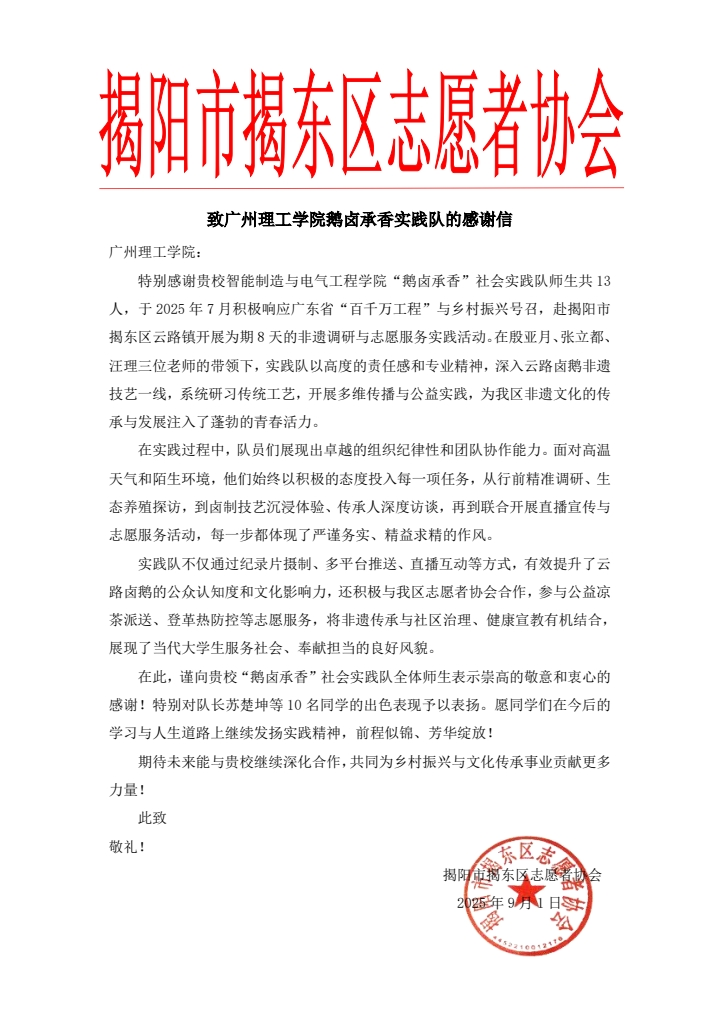 特别值得一提的是,揭东区志愿者协会现场宣读了一封致韦德官方网站实践队的感谢信。信中对同学们在“鹅卤承香”非遗传承与志愿服务项目中展现出的无私奉献、专业能力和青春活力致以诚挚谢意,充分肯定了他们为当地文化传播和社区服务带来的积极影响,并热烈欢迎更多广理学子来到揭东开展社会实践。