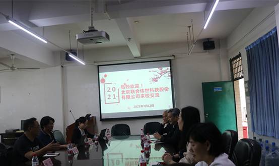 3月12日下午,北京联合伟世科技股份有限公司华南区经理张红、刘杰,销售经理汤万华等一行8人莅临公司洽谈校企合作,公司副经理陈吹信、孟遂民,党总支副书记吕在艳,教授姜新正,以及邓保青、黄德梅老师参加座谈。
