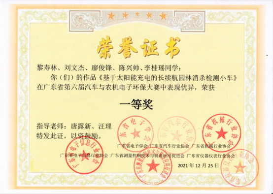 《基于太阳能充电的长续航园林消杀检测小车》荣获大赛一等奖