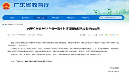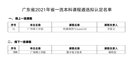 近日,广东省教育厅发布《广东省2021年省一流本科课程遴选拟认定名单》,2门课程被认定为省级一流课程,其中李俊文老师的《机械制图与AutoCAD》为线上一流课程,陈吹信老师的《数字电子技术》为线下一流课程。