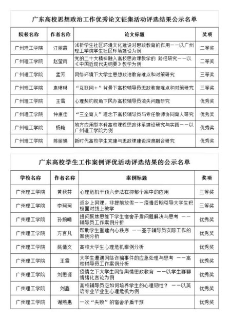 近日,由高校思想政治工作队伍培训研修中心(华南师范大学)和广东省高等公司思想政治教育研究会组织开展的广东高校员工工作案例和思想政治工作优秀论文征集活动结果揭晓,公司仲康佳、谢燕惠两位辅导员老师取得优异成绩!