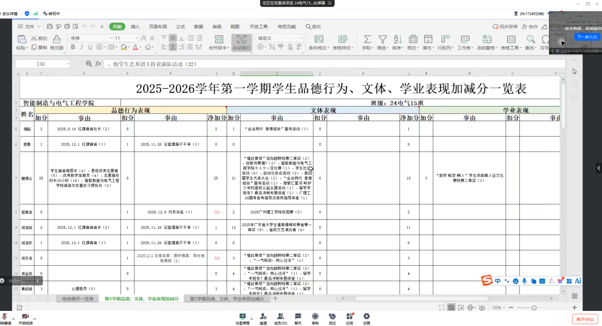 随后,梁泽信同学和巫文峰同学结合《公司2025员工手册》及综测实施办法,围绕品德行为表现、学业表现、文体表现三大核心模块,逐项解读评分标准、加分规则与计分逻辑。同时,针对综测填报、材料审核、分数核算等环节的常见误区、易错点与注意事项进行细致说明,提醒班委规范流程、细致核对,避免漏报、错报、重复计分等问题。