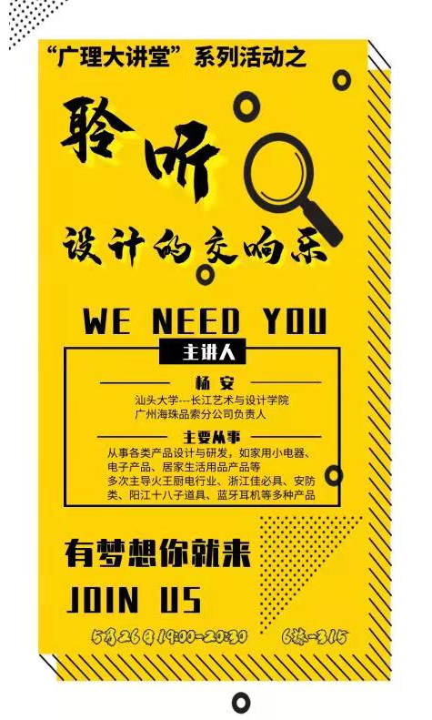 机电工程公司工业设计系5月26日晚于6-315课室举办了以“聆听设计的交响乐”为主题的讲座,本次讲座邀请到杨安老师,原汕头大学长江艺术于设计公司客座教授,广州海珠品索分公司负责人,面向工业设计、产品设计、数字媒体艺术等几个设计专业的同学进行分享。