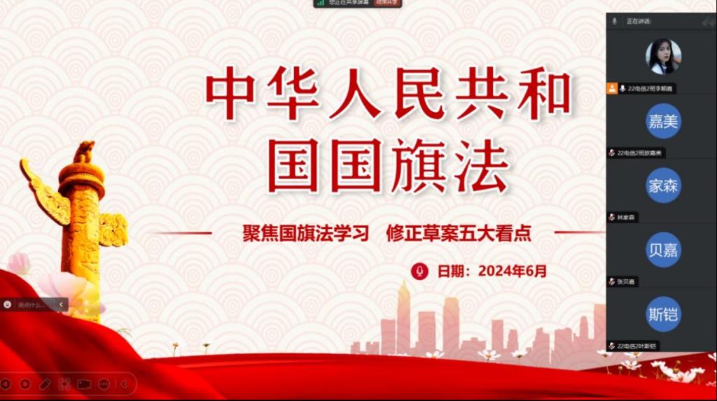 为呼吁同学们共同遵守《中华人民共和国国旗法》,尊重并维护国旗的尊严和荣誉,bevictor伟德官网于6月10日组织各班级召开“聚焦国旗法学习,了解修正草案五大看点”的线上主题班会。班会内容着重强调了维护国旗尊严的重要性,并鼓励同学们积极参与国旗的升挂、使用和保护,共同为弘扬爱国主义精神贡献自己的力量。