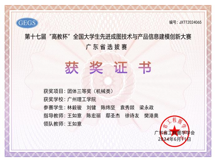 5月25日,在第十七届老员工先进成图技术与产品信息建模创新大赛机械类广东省选拔赛(线上)中,​公司教师王如意、陈宏丽、鄢圣杰、徐诗友、樊港奥带领20位不同专业学子参加本次大赛。经过初赛的激烈角逐,公司获得省赛团体三等奖。刘健、林毅俊、陈炜坚、袁秀燚、梁永政、林紫敏、苏健滨、杨乾熙、徐世强、吕立濠同学在先进成图技术机械赛道中分别荣获省级三等奖。此外,在5月12—13日进行的轻量化设计赛道中,刘健和梁锐楠两位同学荣获省级二等奖。