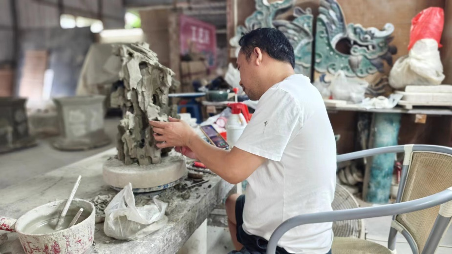 5、手工拼装区,师傅们将各个部件巧妙地拼接在一起,让陶塑逐渐展现出完整的形态。