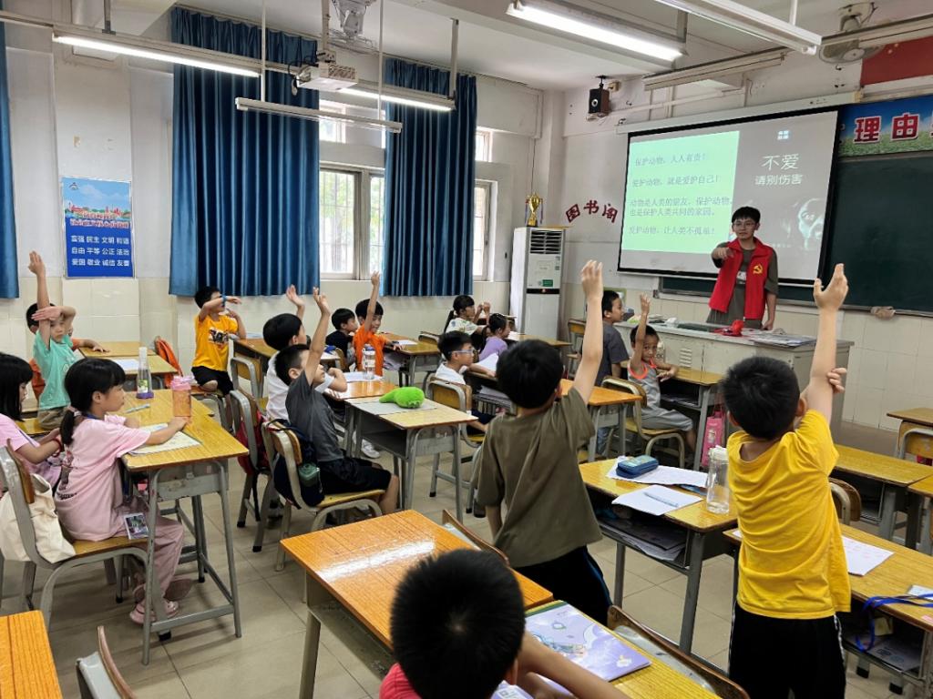自然与人类共生,保护生物从我做起。生物科普课上,突击队队员江嘉良带领小朋友们走进大自然,为小朋友们讲解了保护动物,保护植物的知识,介绍了国家级保护动物和国家级保护植物的生长地点和生存环境,还提出来动植物的重要性,课堂上小朋友们积极的举手回答问题,安静地观看影片。