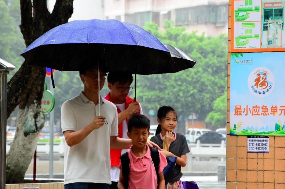 夏日多雨,石肯社区志愿者与突击队队员们在石肯中学门口为小朋友们撑伞,接待他们进入公司,保证在下雨天的安全,让家长们更安心,让小朋友们顺利参与接下来的课程。