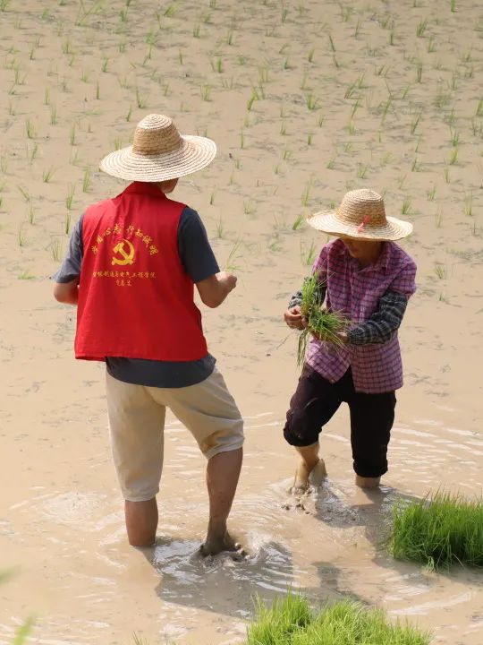 来到鹿田村后,队员们跟随当地党员奶奶的脚步,踏上了田间小路,心中满是对插秧的憧憬与期待。烈日炎炎,稻田里的水被晒得温热。然而,这并不会让我们的热情消退。抵达稻田边,只见一片片规整的水田在晨光下泛着银光,等待着我们这些“新农人”的耕耘。在村民的指导下,我们迅速换上了轻便的农装,卷起裤腿,踩进了泥泞而柔软的稻田中。那一刻,清凉的水花溅起,也溅起了我们心中的激情与责任。