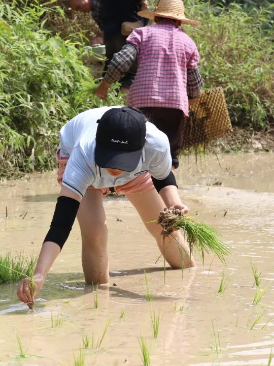起初,我们对插秧这项看似简单的农活感到有些生疏。村民们则耐心地在一旁示范,讲解着插秧的要领:手握秧苗,手指轻轻捏住根部,弯腰将秧苗插入泥土中,每株之间的距离要恰到好处,既要保证足够的生长空间,又要确保稻田的整体美观。队员们也学着村民的动作--弯下腰,左手分秧,右手插秧,动作逐渐从生疏变得熟练。每一株秧苗的插入,都倾注着他们对土地的深情。尽管每个队员汗水如雨般落下,脸晒得通红,泥水溅满了全身,但他们的眼神中始终透着坚定和专注。“参与这次插秧活动,让我深刻体会到农民的辛勤付出,也明白了粮食的珍贵。”一位队员擦着汗水说道。
