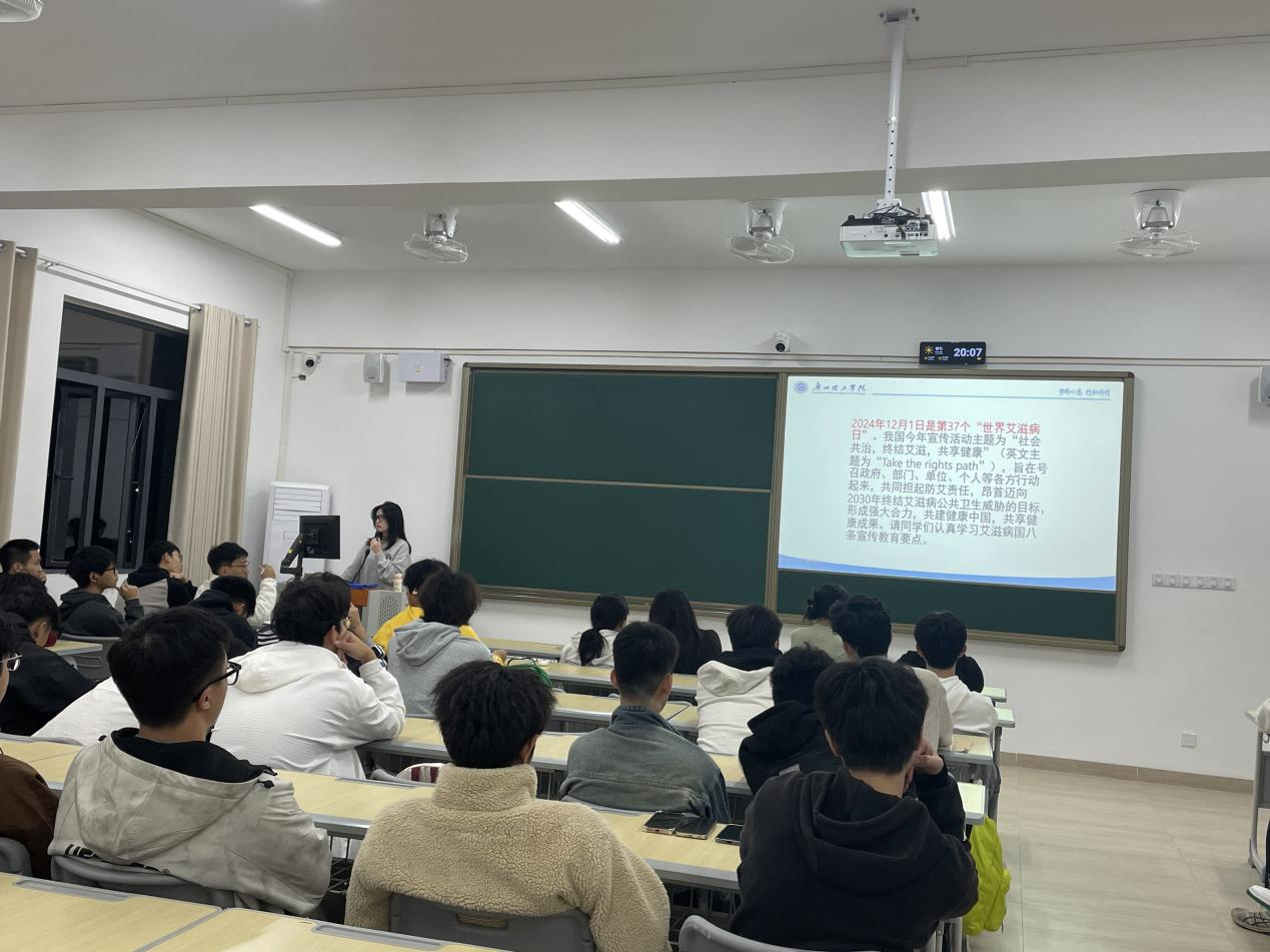 为进一步提升同学们对于艾滋病的认知,增强同学们的健康安全意识和自我保护能力,普及艾滋知识,12月1日晚,bevictor伟德官网全体2024级同学在惠州校区教学楼召开“青春无艾,共享健康”主题班会,班会由各班辅导员老师主持,团支书兼班长主讲。