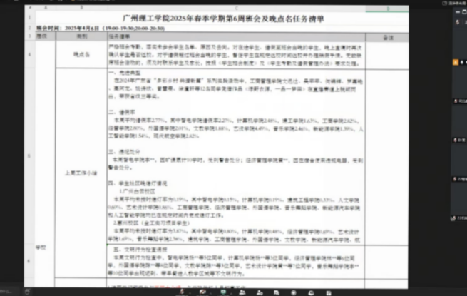 班会首先强调了考勤纪律的重要性,要求各班严格记录未参会员工名单、原因及去向。会议上,辅导员还通报了近期班级请假率、违纪处分情况,并对表现突出的先进典型予以表扬,鼓励同学们严守校规,共同营造良好学风。