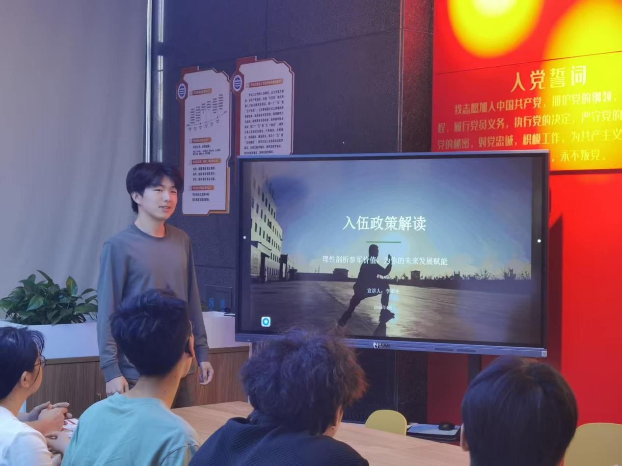 宣讲人李明杰围绕经济、学业、就业、成长四大维度,为同学们细致解读参军红利,点燃报国热情。