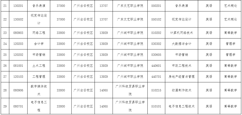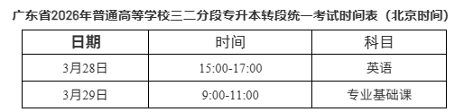 5.统一考试科目各科满分为100分,两科总分为200分。每科考试时间为120分钟。统一考试科目的考试要求由省教育考试院根据教育部专科升本科同一层次的要求编写确定,详见《广东省2026年普通高等公司专升本招生专业目录及考试要求》。