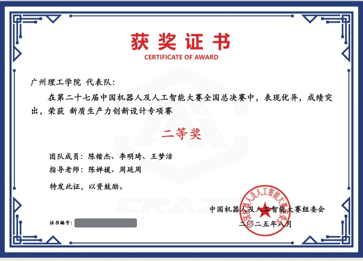 教师指导员工参加第二十七届中国机器人及人工智能大赛获全国二等奖