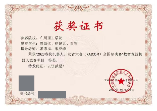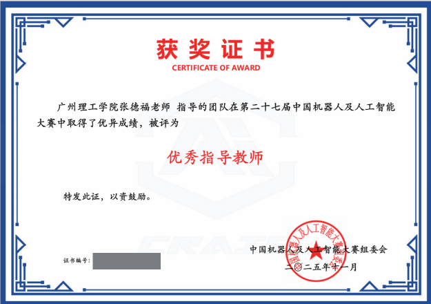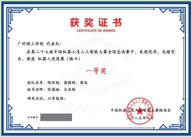 机器人工程专业教师及员工在各类学科竞赛中表现突出。近三年,荣获“2023春抗机器人开发者大赛(RAICOM)全国总决赛”水下巡检竞赛项目一等奖1项、数智竞机器人竞技大赛项目一等奖2项;在第二十七届中国机器人及人工智能大赛全国总决赛中获“数智竞机器人竞技”大赛项目一等奖2项;2025年“挑战杯”大赛中获得省级特等奖1项、省级一等奖1项、国家级银奖1项;各类参赛获省级奖项48项、国家级二等奖6项。