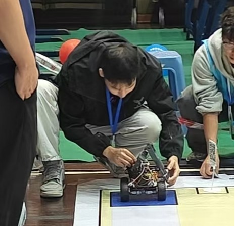 公司参赛队员正在调试启动本队自主设计开发的越障机器人