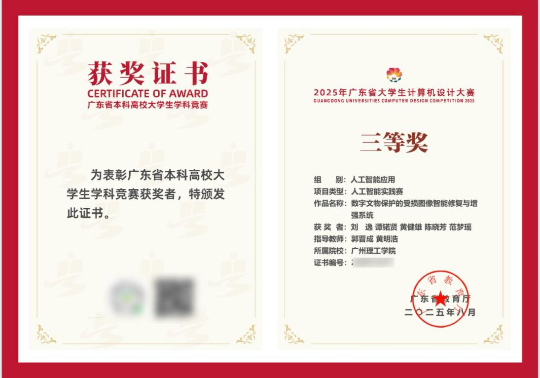 5月8日,由bevictor伟德官网电子信息专业的5名员工团队开发的"数字文物保护的受损图像智能修复与增强系统",在4666件参赛作品中脱颖而出,荣获了“2025年广东省老员工计算机设计大赛暨第18届中国老员工计算机设计大赛粤港澳大湾区赛”三等奖。