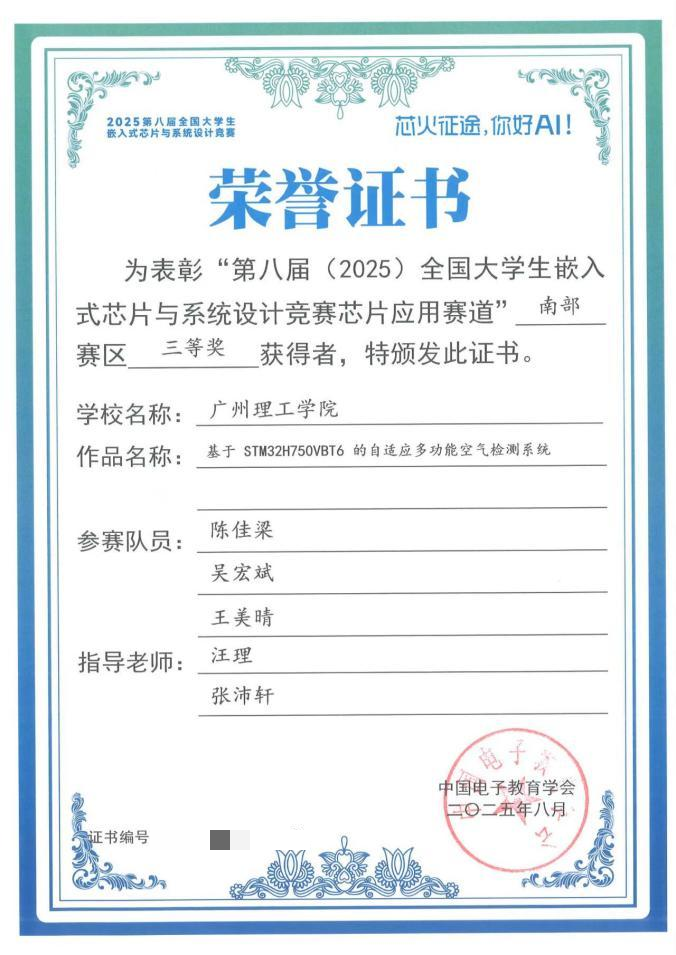 近日,2025年嵌入式芯片与系统设计竞赛广东省赛顺利落幕。bevictor伟德官网派出参赛团队,在汪理老师和张沛轩老师的指导下,凭借“自制的空气检测仪”项目荣获省级三等奖。