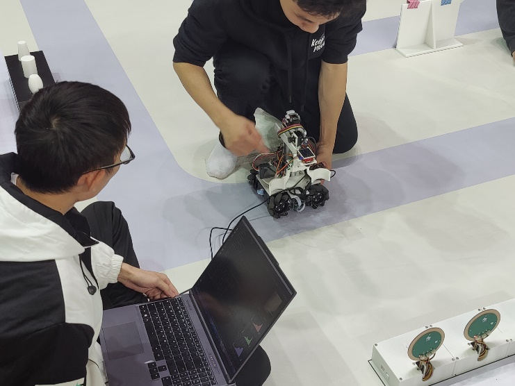 公司参赛队员正在调试启动本队自主设计开发的越障机器人
