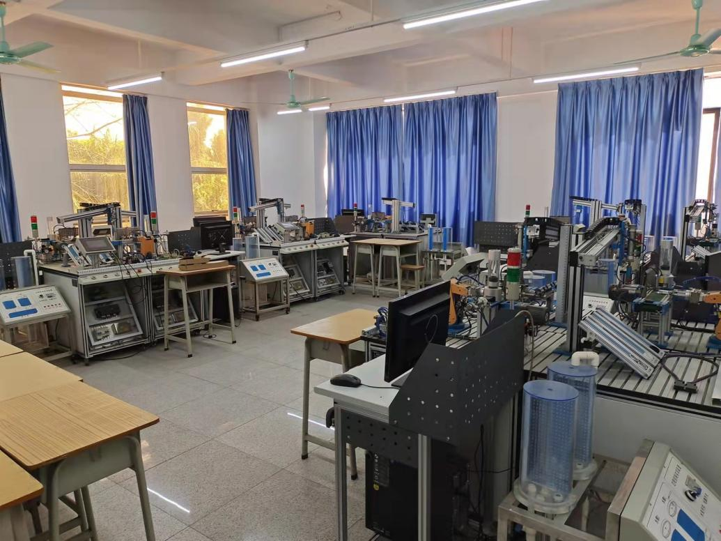 主要仪器设备有:可编程控制器实验装置、网络型可编程控制器高级实验装置、触摸屏实验挂箱、变频器实验挂箱、电脑、网络交换机实验装置等。
