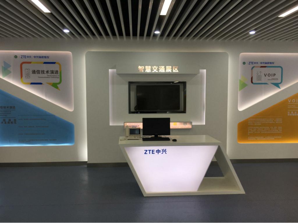 ICT展厅里中能看到中兴通讯目前所掌握的最前沿的光传输产品,4G通信产品、基础产品等等。这4个显示屏分别对应4G-LTE基础通信、数据通信、PTN光传输、XPON光接入、现代交换等技术,采用了视频与中兴通讯目前最先进的设备详解后,且与电信运营商现网运行设备完全一致的设备进行介绍和展示。ICT展厅与前面介绍的实验室一起旨在打造一个与现网完全一致的真实环境,起到教学和科研两方面作用:教学方面采用“理实结合方式”让我们的员工在一个与现网完全一致的设备环境中学习、实践,未来到工作岗位后在技术技能方面实现无缝对接。