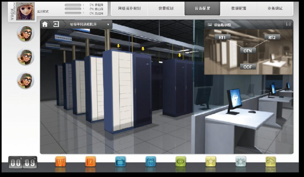 实验机房主要涉及平台有“数据通信、PTN光传输、XPON光接入、现代交换技术4G-LTE基础通信、配套教学的还有4G全网建设仿真软件,PTN仿真软件,3G(TD-SCDMA)仿真软件,网络优化CXA\CXT软件,”采用了中兴通讯目前最先进的设备,而且是与电信运营商现网运行设备完全一致的设备。旨在打造一个与现网完全一致的真实环境,起到教学和科研两方面作用:教学方面采用“理实结合方式”让我们的员工在一个与现网完全一致的设备环境中学习、实践,未来到工作岗位后在技术技能方面实现无缝对接。科研方面也是我们基地进行科研工作的硬件环境。