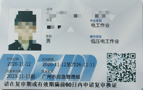 特种作业操作证-低压电工作业(俗称上岗证)。发证机关:广州市应急管理局。全国范围内有效。特种作业操作证有效期为6年,每3年复审1次。培训模块包括安全用具使用、安全操作技术、安全隐患排除、现场应急处置四个模块。所需掌握的安全技术知识:安全基本常识、安全技术基础知识、安全技术专业知识。其中安全技术知识包括:触电事故及现场救护;防触电技术;电气防火与防暴;防雷和防静电。安全技术基础知识包括电工基础知识;电工仪表及测量;安全用具与安全标识;手持式电动工具和移动电气设备。安全技术专业知识包括低压电气设备;三相异步电动机;电气线路;电气照明;电力电容器。通过培训后需要掌握的基本技能:低压电器设备安装与调试操作;低压配电及电气照明安装操作、电气设备维护与检修操作、电工测量操作、防火防雷设备使用操作、安全用具使用操作、触电急救操作。