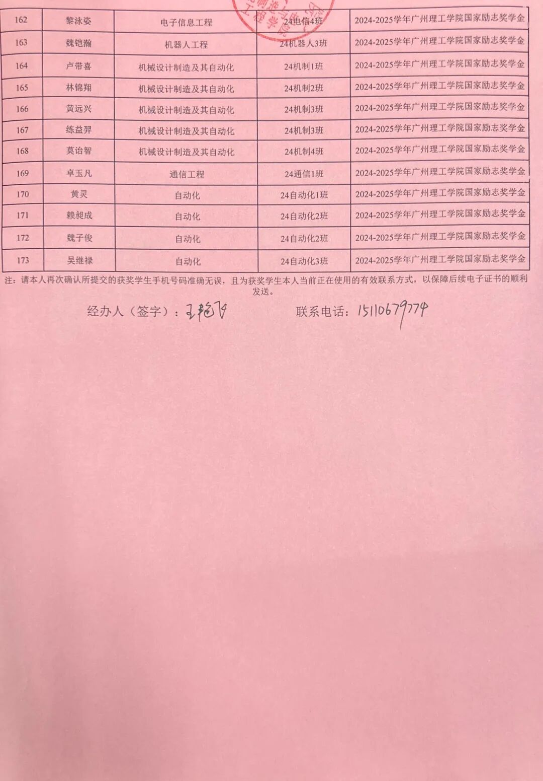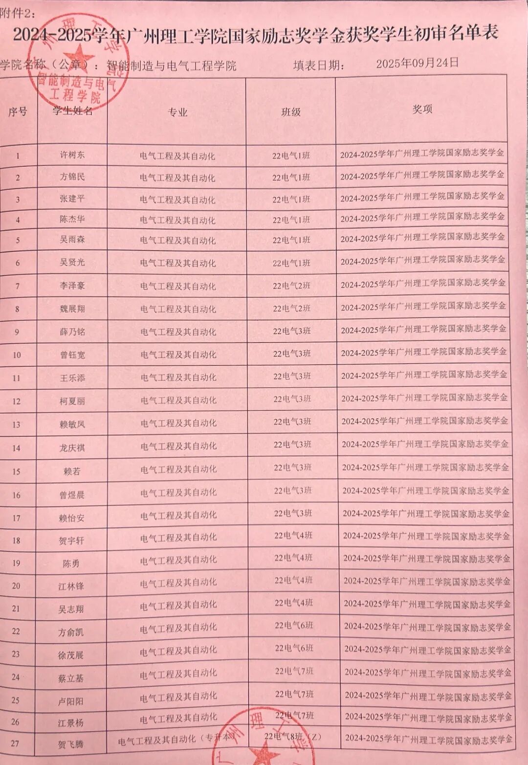 根据《关于开展2024-2025学年国家励志奖学金评选工作通知》(广州理工学助函〔2025〕11号),经员工本人申请及公司评议,现将公司2024-2025学年国家励志奖学金拟推荐名单在公司校园网主页、公司公众号予以公示。公示时间从2025年9月24日至2025年9月26日止。公示期间,任何个人和单位均可通过来信、来电、来访等形式向公司反映公示对象的情况和问题。反映情况时请签署真实姓名和联系电话,有具体事实;匿名将不予受理。