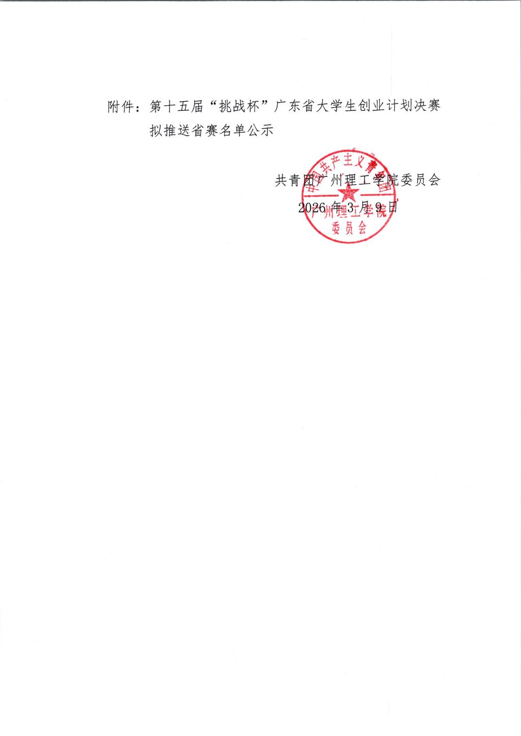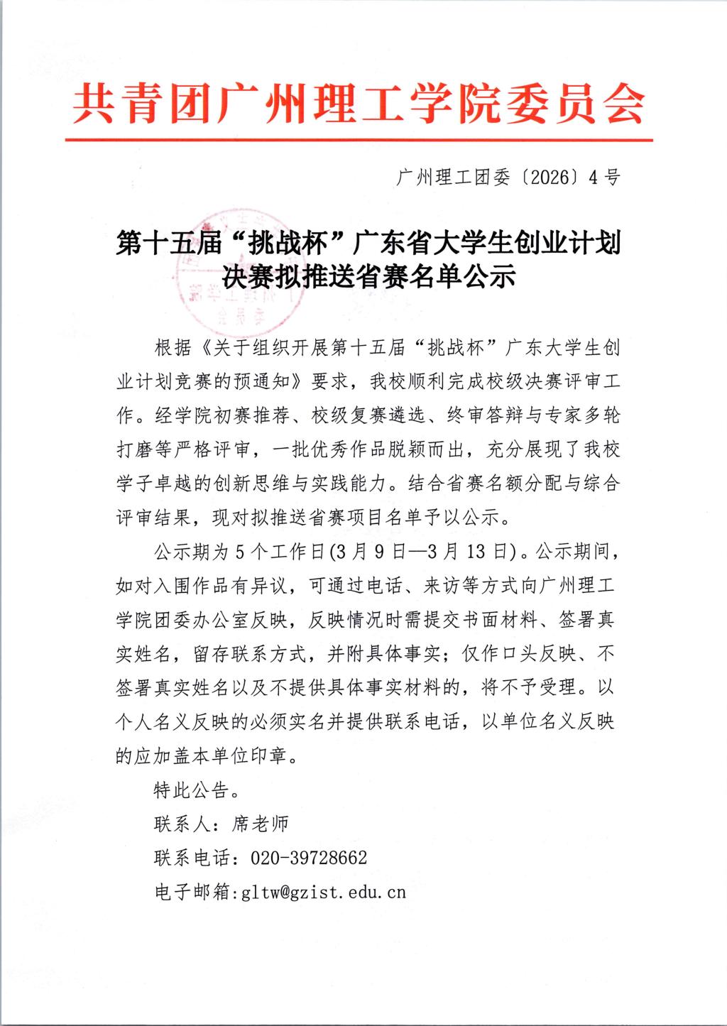 广州理工团委〔2026〕4号韦德官方网站第十五届“挑战杯”广东省老员工创业计划决赛拟推送省赛名单公示.pdf
