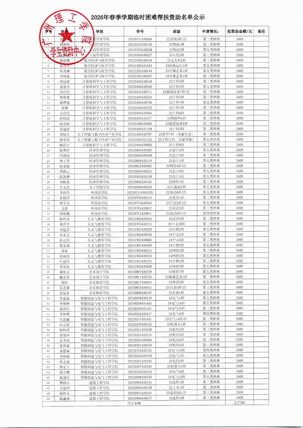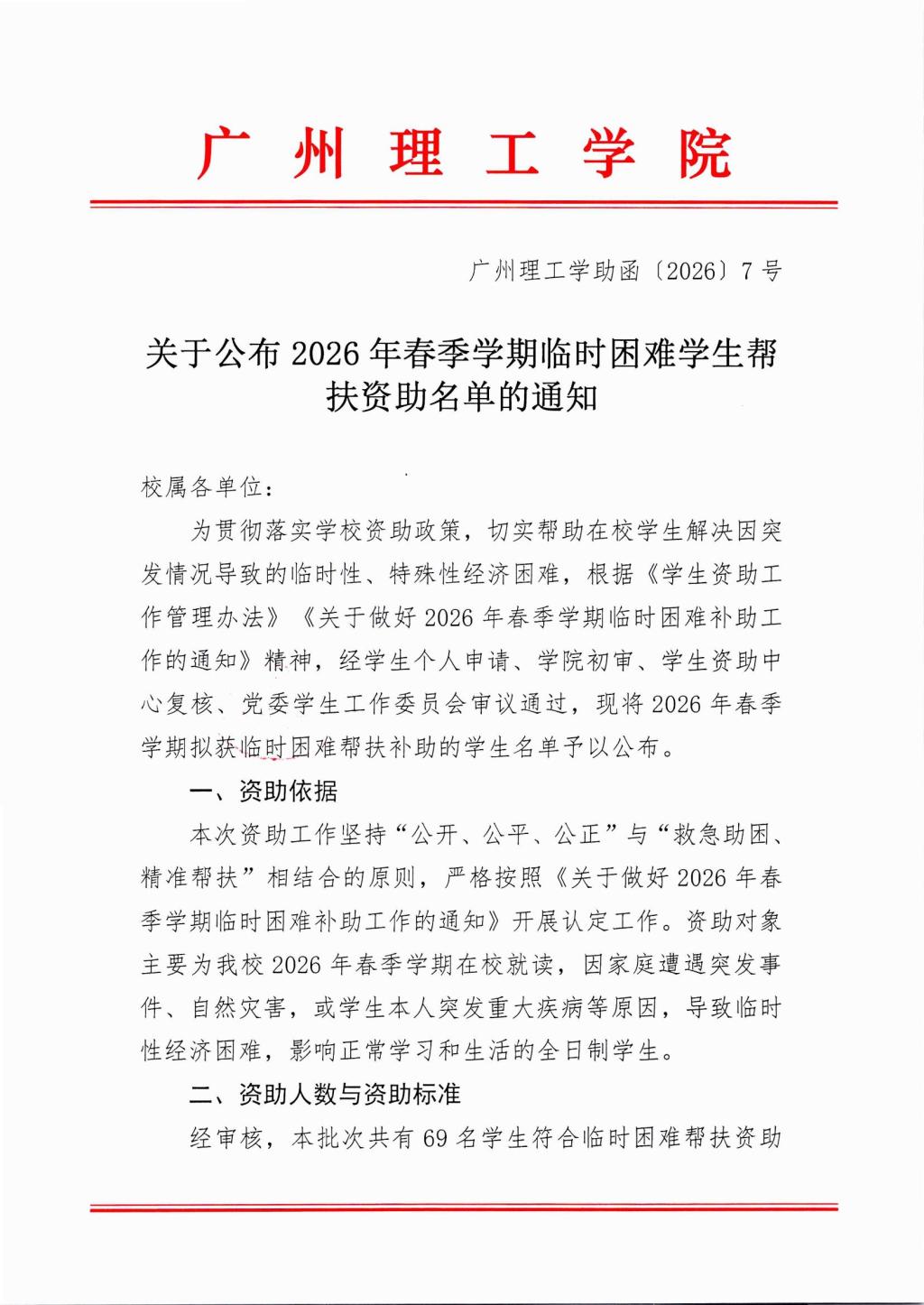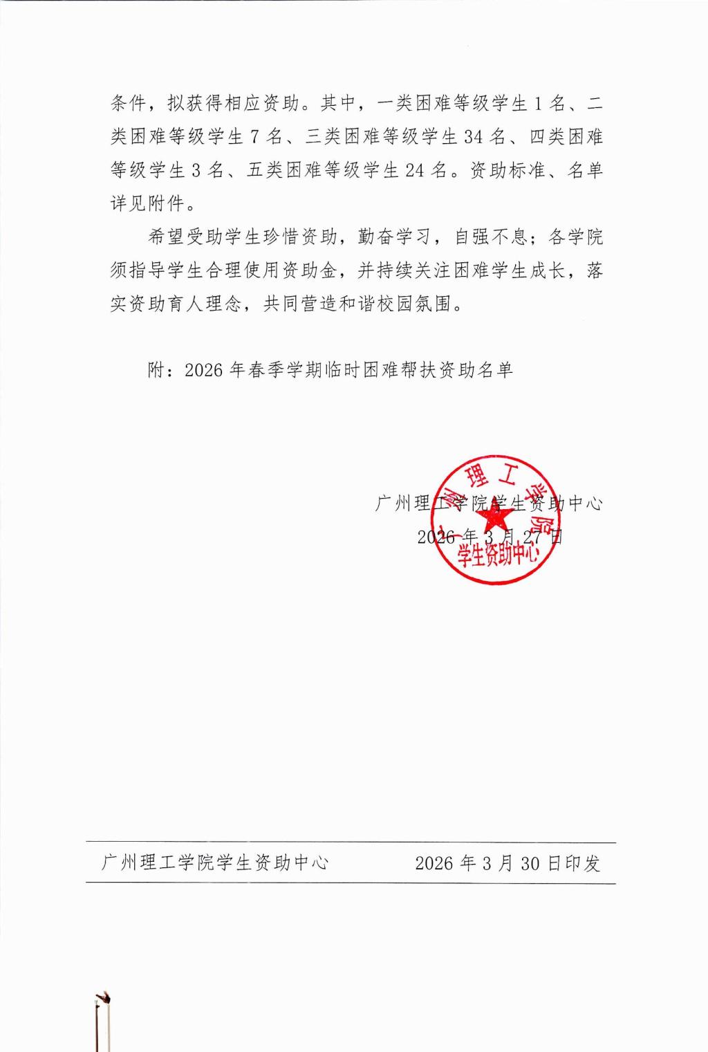 关于公布2026年春季学期临时困难帮扶资助名单的通知
