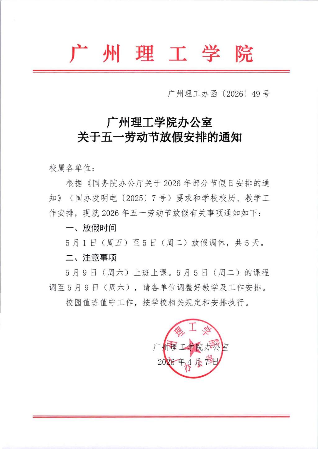 关于五一劳动节放假安排的通知